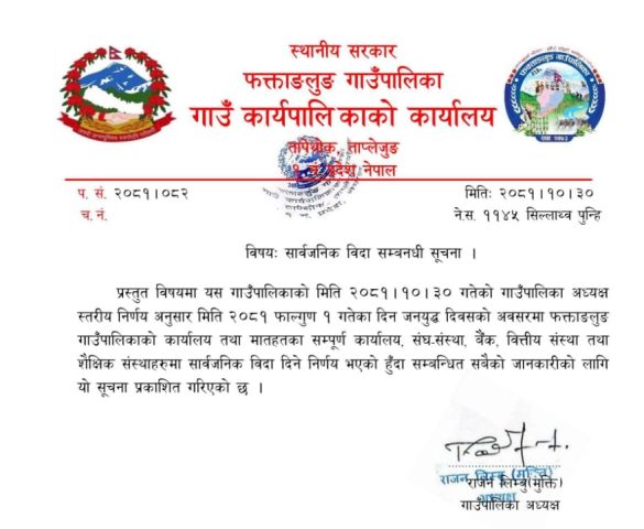 पालिका अध्यक्ष लिम्बूद्धारा जारी गरिएको सूचनामा फागुन १ गते बिहीबार फक्ताङलुङ गाउँपालिकाको कार्यालय तथा मातहतका सम्पूर्ण कार्यालय, संघसंस्था, बैंक र बित्तीय संस्था एवम् शैक्षिक संस्था बिदा हुने उल्लेख छ ।