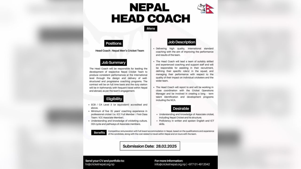 साथै एसोसियट राष्ट्रको खेल गतिविधिबारे जानकार भएको व्यक्ति हुनुपर्ने उल्लेख छ । फेब्रुअरी २८ सम्म आवेदन दिने अन्तिम मिति तोकिएको छ ।
