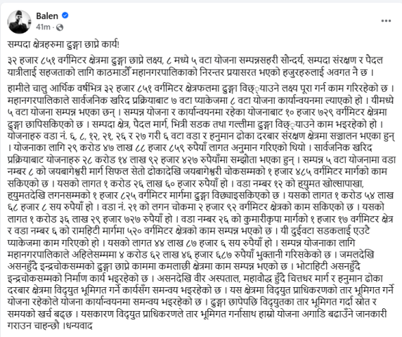 उनले लेखेका छन्, ‘हामीले चालु आर्थिक वर्षभित्र ३२ हजार ८५१ वर्ग मिटर क्षेत्रफलमा ढुङ्गा बिछ्याउने लक्ष्य पूरा गर्न काम गरिरहेको छ । महानगरपालिकाले सार्वजनिक खरिद प्रक्रियाबाट ७ वटा प्याकेजमा ८ वटा योजना कार्यान्वयनमा ल्याएको हो । यीमध्ये ५ वटा योजना सम्पन्न भएका छन् । सम्पन्न योजना र कार्यान्वयनमा रहेका योजनाबाट १० हजार ७२९ वर्ग मिटर क्षेत्रमा ढुङ्गा छापिसकिएको छ ।’