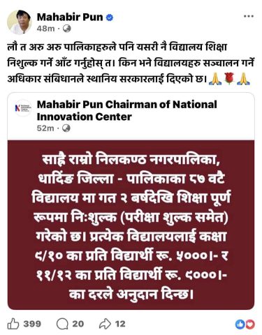 नेपालको संविधान २०७२ को धारा ३१ ले नागरिकलाई शिक्षाको मौलिक हक दिएको र स्थानीय सरकार सञ्चालन ऐन, २०७४ ले विद्यालय शिक्षा व्यवस्थापनको अधिकार स्थानीय तहलाई दिएको उल्लेख गर्दै निलकण्ठ नगरपालिकाले सोही संवैधानिक र कानुनी अधिकार प्रयोग गरेर सार्वजनिक शिक्षालाई निःशुल्क बनाएको उप–प्रमुख दिपक विश्वकर्माले बताए।